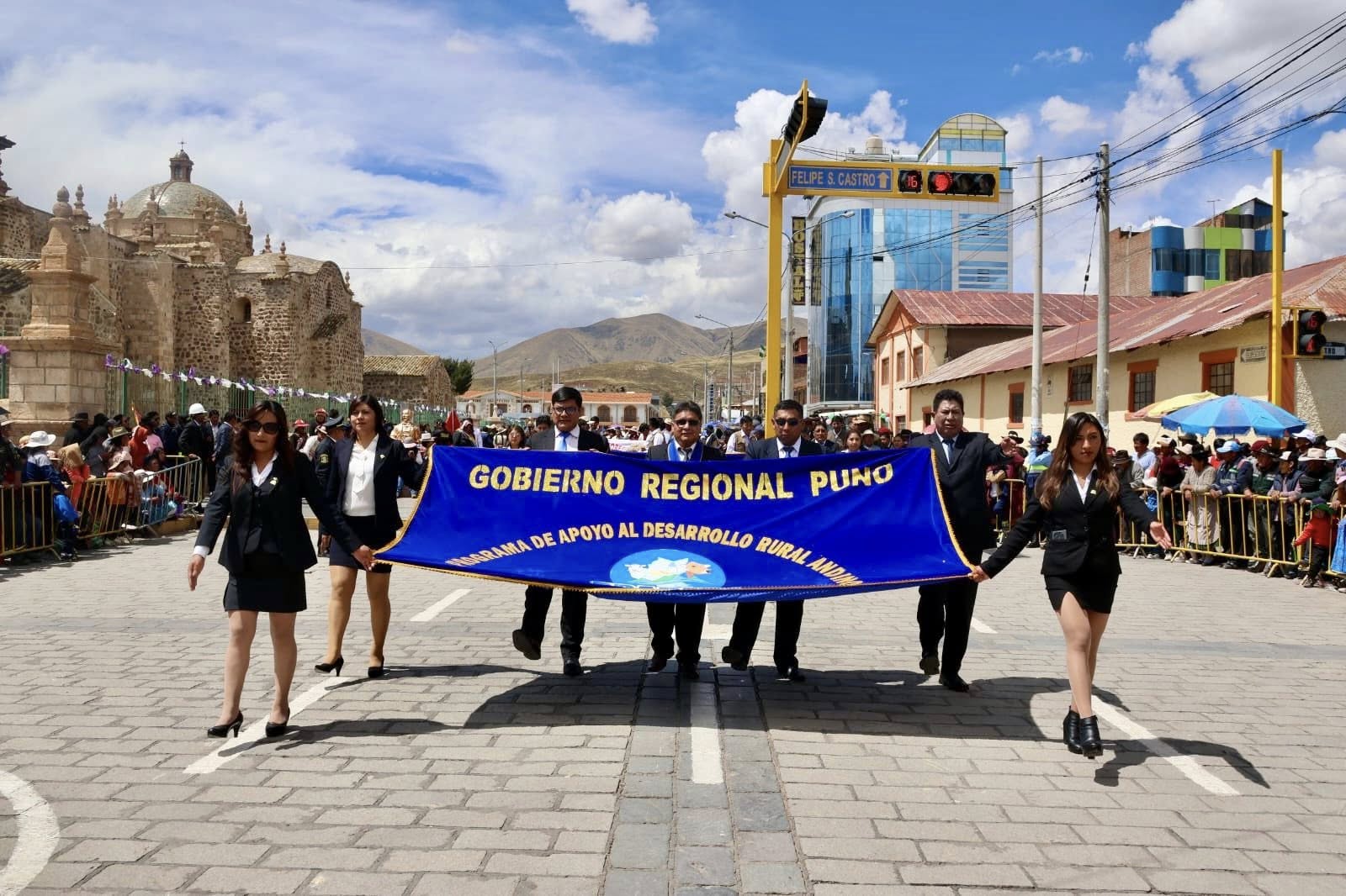 La delegaciรณn fue encabezada por el Director Ejecutivo del Proyecto Especial PRADERA, MVZ. Fredy Edmundo รlvarez Lupaca, en compaรฑรญa del consejero regional por la provincia de Melgar, Esteban Mamani Quispe, quienes junto al equipo tรฉcnico conformado por personal de planta, profesionales y extensionistas de campo y diversas Asociaciones de Productores Agropecuarios de la provincia, dieron lo mejor de sรญ en el desfile institucional.